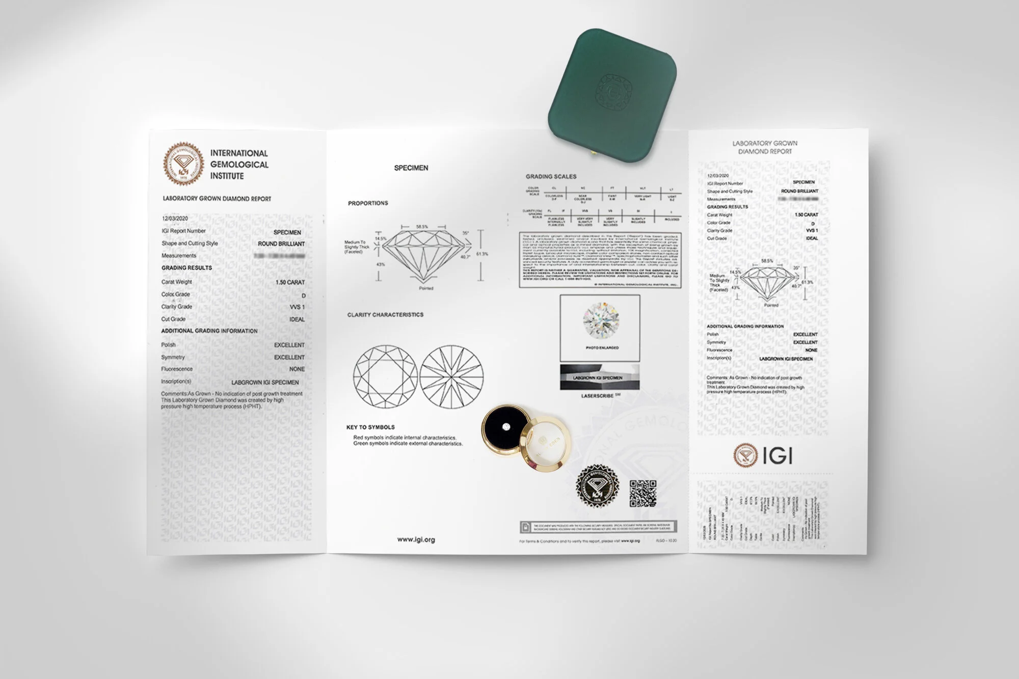 國際寶石學協會 (IGI) 是最大的實驗室培育鑽石、天然鑽石、成品珠寶和寶石的分級機構之一,在世界各地有18個運營實驗室。因應您的要求,IGI爲您評估Sunny Eden™實驗室培育鑽石的質量。
